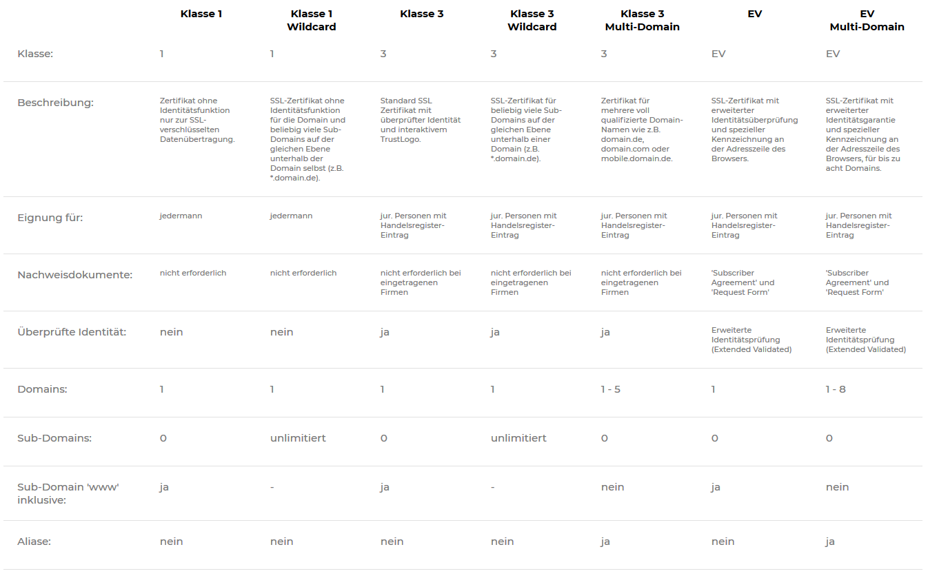 Diese Übersicht hilft bei der Auswahl des richtigen Zertifikats – insbesondere bei komplexeren Anforderungen (z. B. Multi-Domain- oder EV-Zertifikaten).